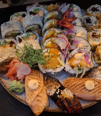6x futomaki hirame panko (halibut w panko, awokado, rzodkiew, tykwa, spicy mayo),